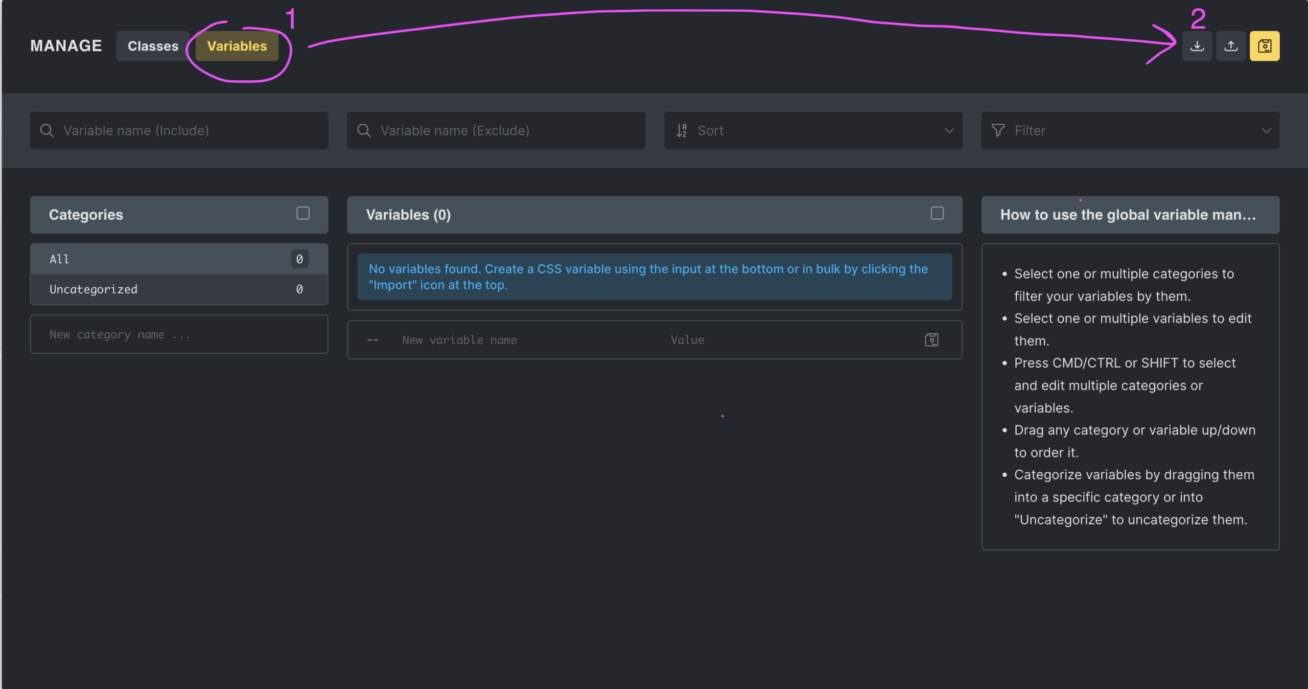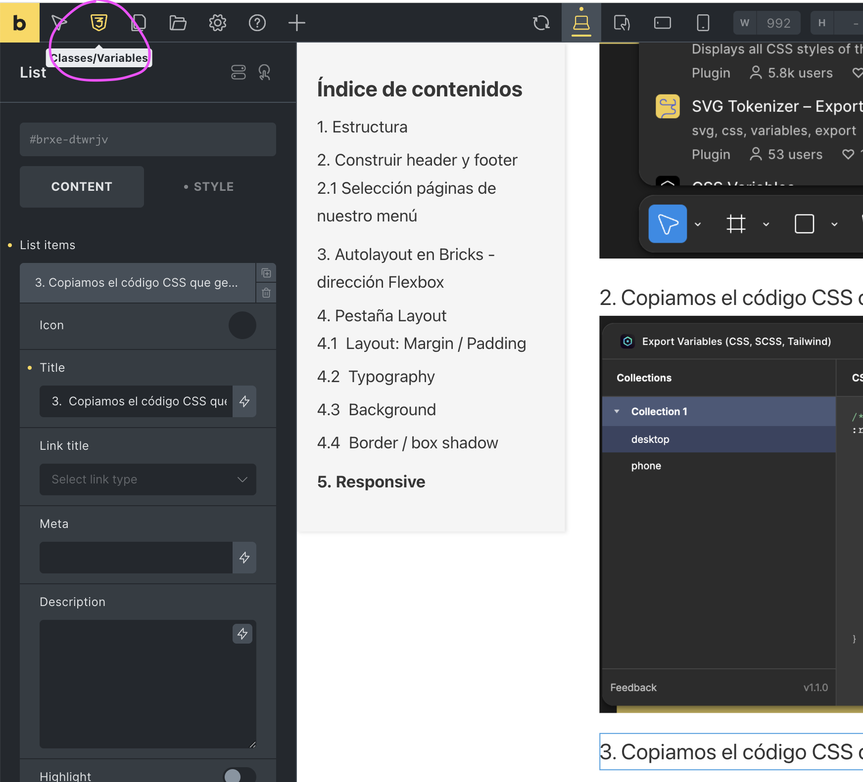 - 3. En Bricks, en la página que estemos editando, clicamos en el menú Classes/Variables para poder importar el CSS, ver las siguientes imágenes.
