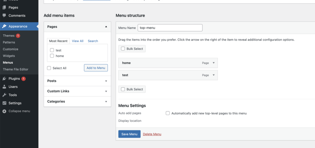 Para crear un menú de nuestras páginas iremos al menu: Appearance>>>Menus.