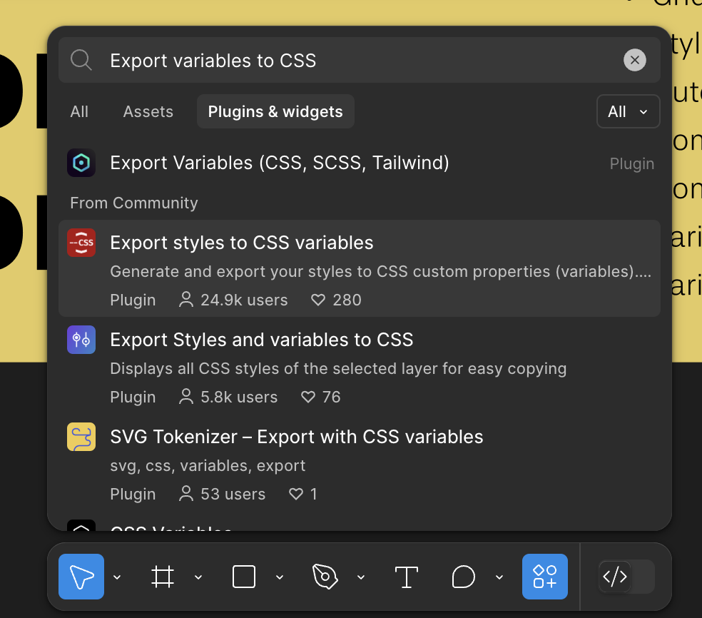 - 1. Vamos a Figma >> Plugins & Widgets y buscamos, Export variables to CSS