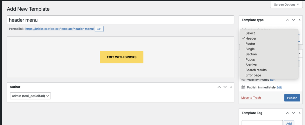 Opción añadir new template, colocamos el nombre, por ejemplo header menu y seleccionamos de que tipo de plantilla se trata. En este caso HEADER. Apretamos botón Publish = guardar y procedemos a editar en Bricks (botón Edit with Bricks).