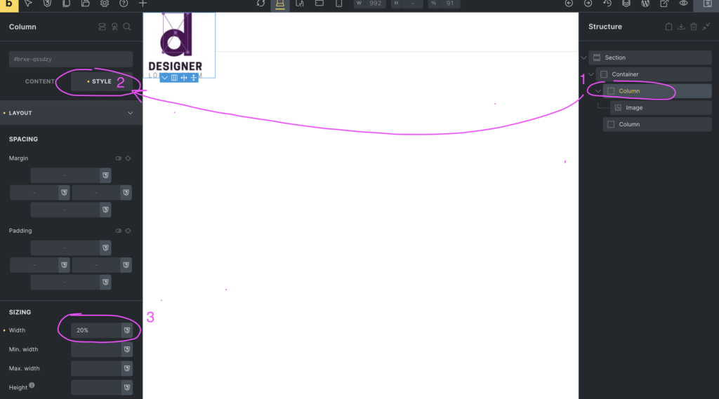 Podemos controlar los anchos de las columnas si, seleccionamos la columna y vamos a la pestaña Style, opción Layout y en width reducimos el tanto por ciento por ejemplo 20%.