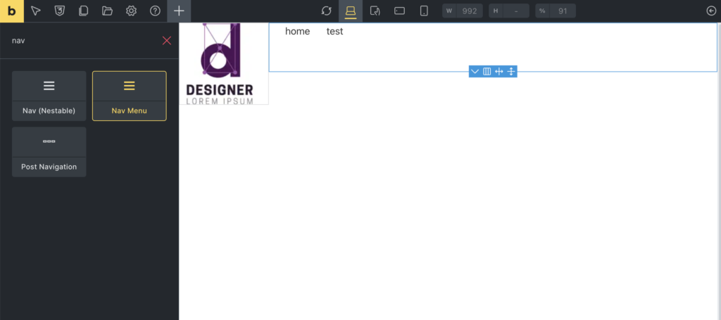 En este ejemplo colocaremos el menú de nuestra web. Vamos Elementos + y seleccionanos Nav Menu y guardamos. Seleccionamos el menú de nuestra web, ver siguiente apartado.