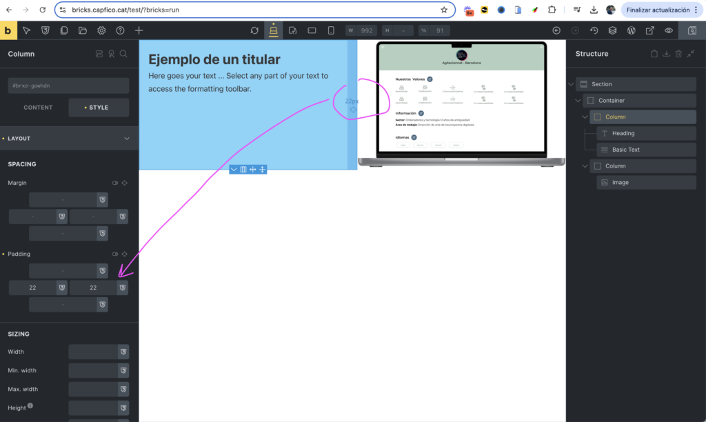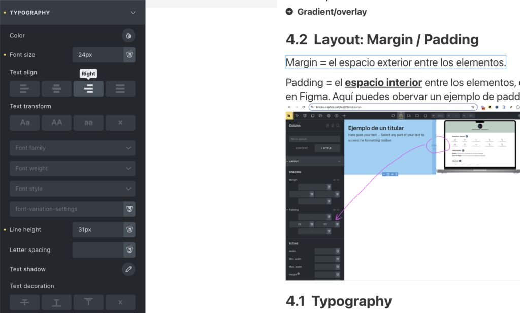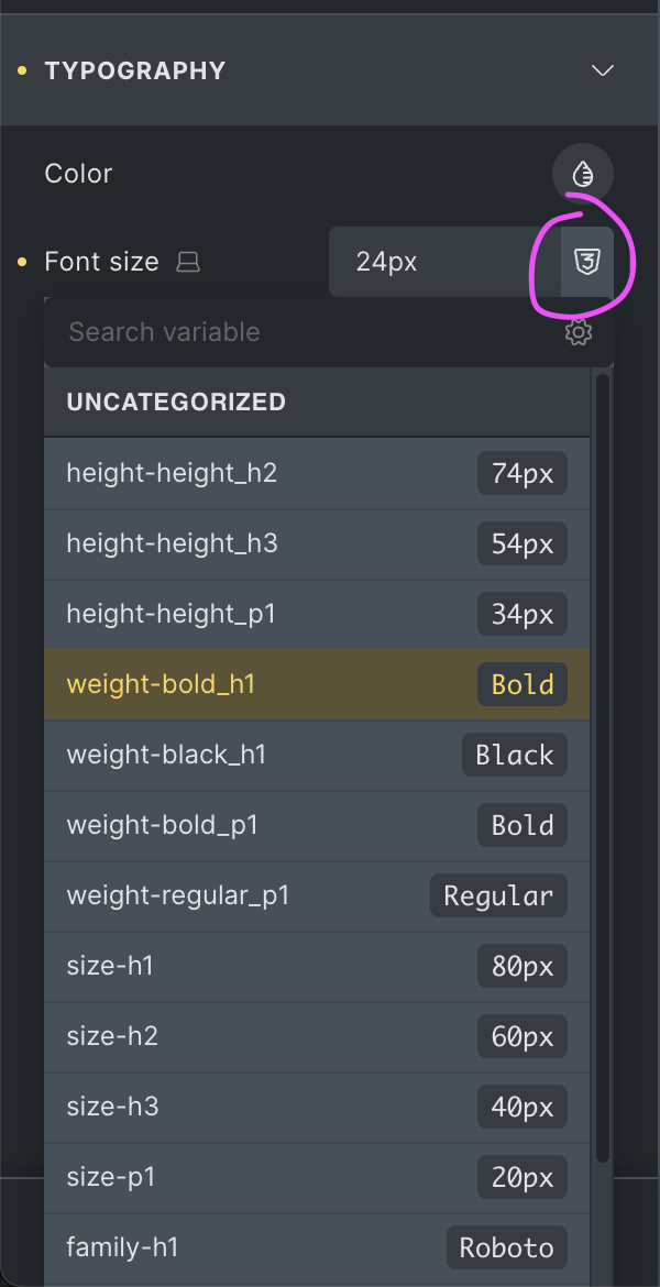 A partir de ahora podemos utilizar nuestras Variables de Figma en nuestra maquetación de Bricks, clicando sobre el icono de variables que aparece en la configuración de los elementos como tipografía, padding, colores,.... Como en este ejemplo donde aplicamos una variable de tamaño en el texto.