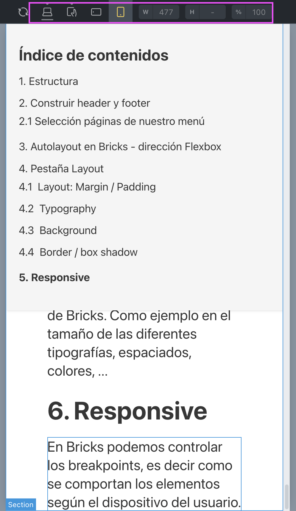 En Bricks podemos controlar los breakpoints, es decir como se comportan los elementos según el dispositivo del usuario.