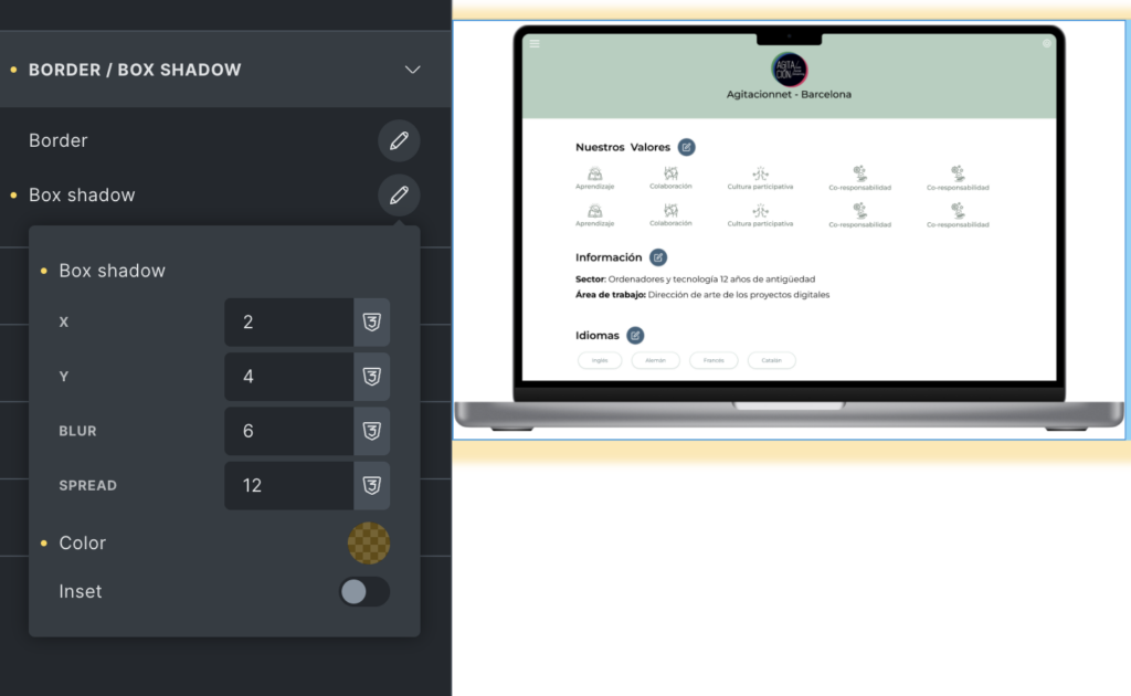 Box shadow: sirve para configurar las sombras, con su posición en X e Y, efecto blur, spread, color, opacidad...
